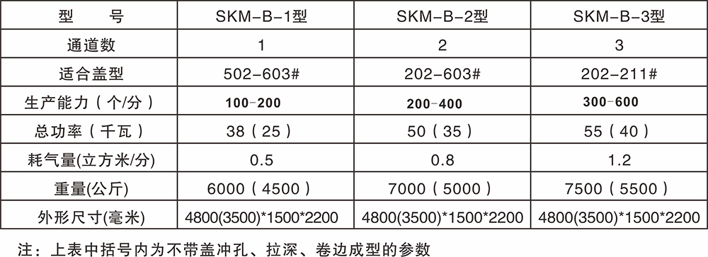 SKM-B系列鋁箔易撕蓋生產(chǎn)設(shè)備 該系列設(shè)備可用來生產(chǎn)202-603#易撕蓋,尤其適合于307-603#大型的鐵易撕蓋。自動完成下蓋、沖孔、拉深、卷邊、沖鋁箔預(yù)封、封口、壓花、輸出等功能。獨立伺服控制的各功能模塊,可單獨調(diào)節(jié)參數(shù),并可實現(xiàn)高速響應(yīng)及同步動作,斜沖排列的方式可使鋁箔浪費最少。 可根據(jù)用戶需求,設(shè)計新機型。 圖片,參數(shù)僅作參考,如有改動,恕不另行通知。